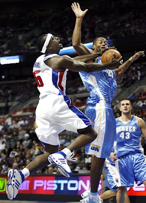 Both teams played well in spurts and equaled each other’s output in the first three quarters. In the first, Denver came out lethargic and only managed to score 20 points as the Pistons put 29 on them in return. George Karl started an unorthodox line-up of Yakhouba Diawara, Linas Kleiza, Marcus Camby, and Stacey Augmon with point guard Chucky Atkins seeing his first preseason action and the Nuggets looked out of sync. On the other hand, the Pistons started their usual five of Chauncey Billups, Rip Hamilton, Antonio McDyess, Tayshaun Prince, and Rasheed Wallace and had no trouble getting into a rhythm early. However, Denver did managed to put together a better second quarter, matching the Piston’s 34 points in the period, and in doing so kept things reasonable going into the second half.